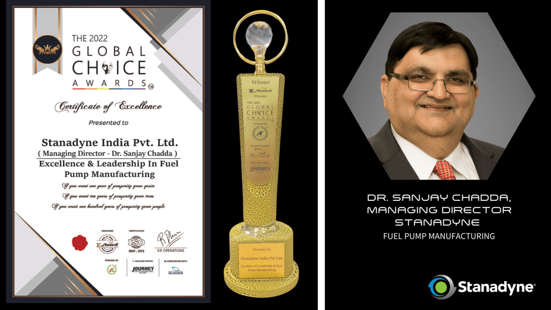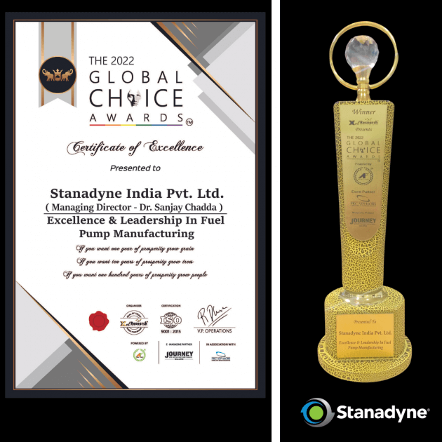Chennai, India – April 27, 2022 – Managing Director, Near East, Dr. Sanjay Chadda has received a 2022 Global Choice Award for Leadership, Service, and Business Excellence from Xel Research. As part of the 8th Global Choice Awards program, Dr. Chadda was recognized for Stanadyne’s fuel pump manufacturing efforts to solve customers’ challenges and build trust and credibility by providing value-added service.