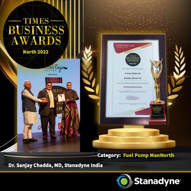 Chennai, India – July 7, 2022 –Stanadyne India received a 2022 Times Business Award in the Fuel Pump Manufacturing category from Optimal Media Solutions, a division of Times Internet Limited, in partnership with Avance Insights, an independent research agency. The 2022 Times Business Awards identifies top leaders from different professional categories who have made significant economic and social contributions to India in the last year.